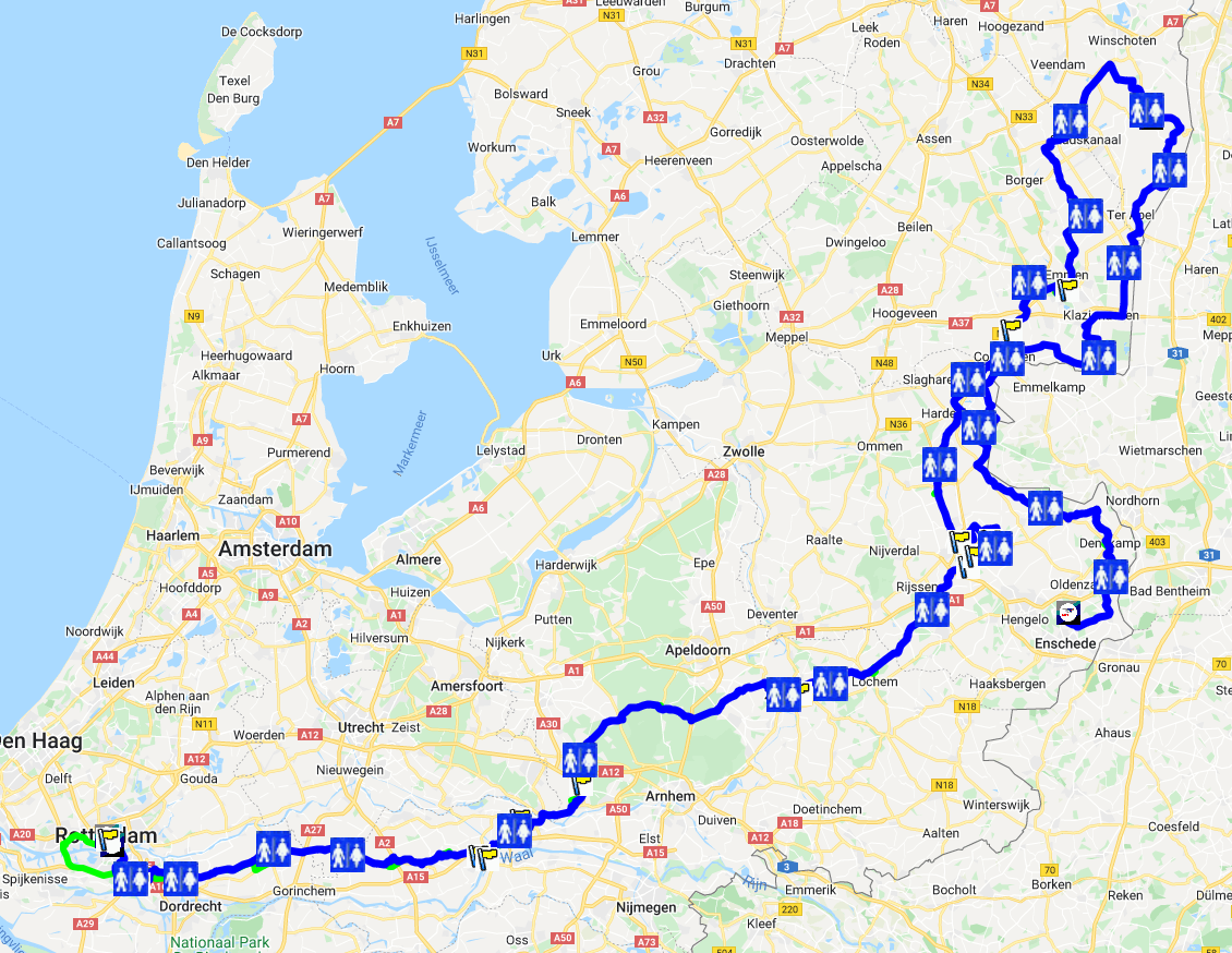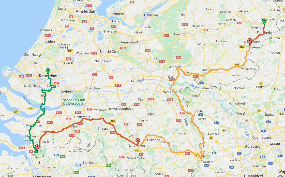 We starten zoals gebruikelijk met twee korte etappes. Dan kunnen beide bussen even lekker op gang komen en hopen we onderweg minder last te hebben van andere teams die op ‘onze’ wisselplekken staan. Dit jaar blijven we volledig in Nederland en starten we vanaf het evenemententerrein vliegveld Twenthe. Eerst naar het noorden via Coevorden naar Ter Apel en het noordelijkste punt van de route, Oude Pekela. Vanaf daar terug naar het zuiden om vanaf Almelo de oude vertrouwde route weer op te pakken.