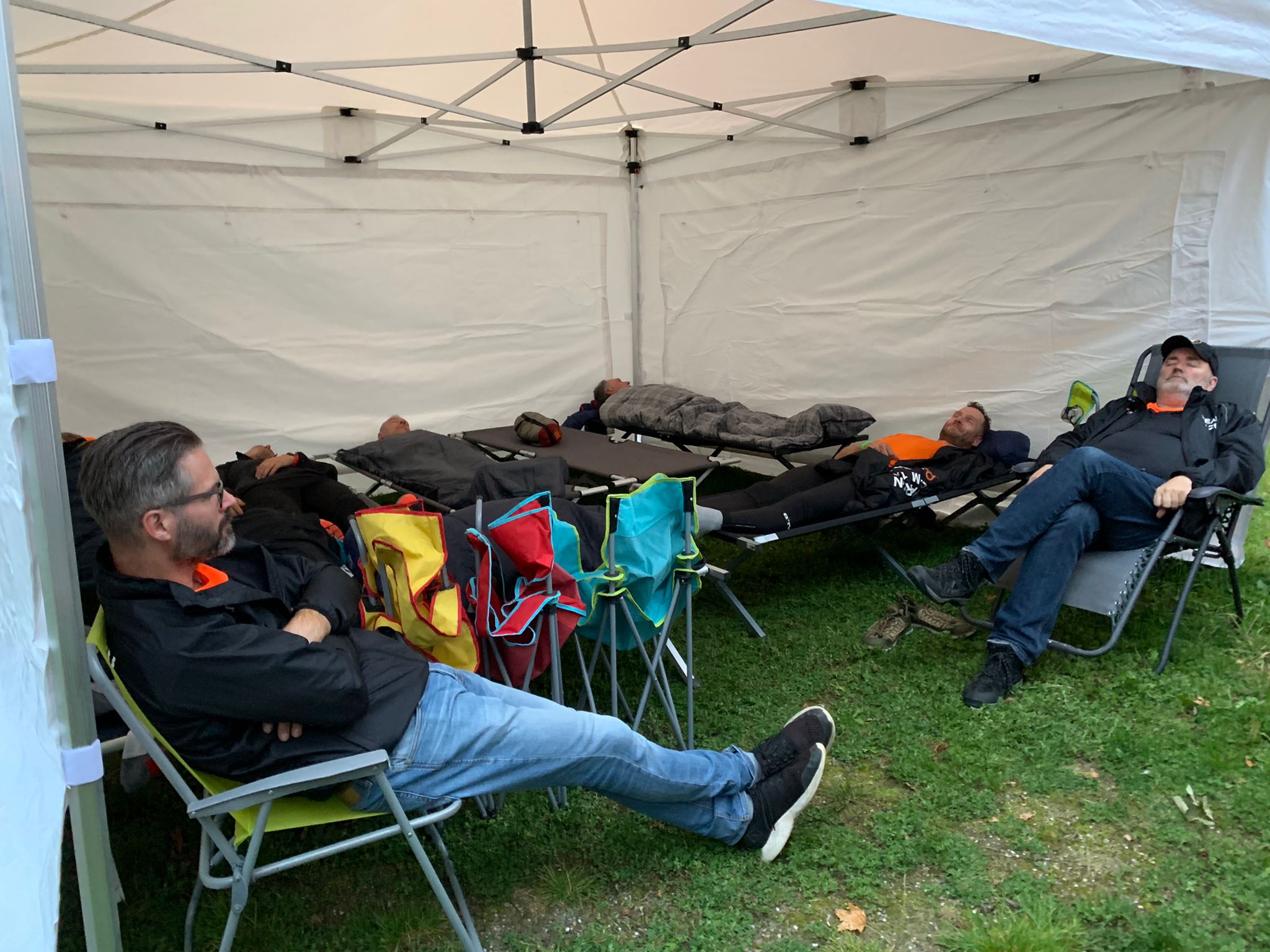 Wij gingen na een bakkie cup-a-soup op weg naar de te huur staande en dus lege brasserie ’t Blaakven in Weert. Een prima gevonden locatie en de tent kon beschut worden neergezet, de bedjes binnen met de slaapzakken en eenieder kon een tukkie doen of in ieder geval even uitrusten. Hans 3 belde ons op tijd wakker zodat onze masseuses Kim en Diana de spiertjes en pijntjes konden wegmasseren… Er was tijd voor een ontbijtje en we stonden alweer te trappelen om op weg te gaan naar Buchten waar het volgende kamp van Busje 1 zou zijn. Deze etappe ging vrij gemakkelijk (in ieder geval voor Hans 2 en mij… haha) natuurlijk het deed zeer bij lopers en fietsers maar ze pepten elkaar daar waar noodzakelijk op en voor we het goed en wel in de gaten hadden… hoewel… Natasja wist het precies hoor, die hield het aantal loopbeurten uitstekend bij en kon exact aangeven wanneer de laatste beurt er aankwam…(Deutsche gründlichkeit?).